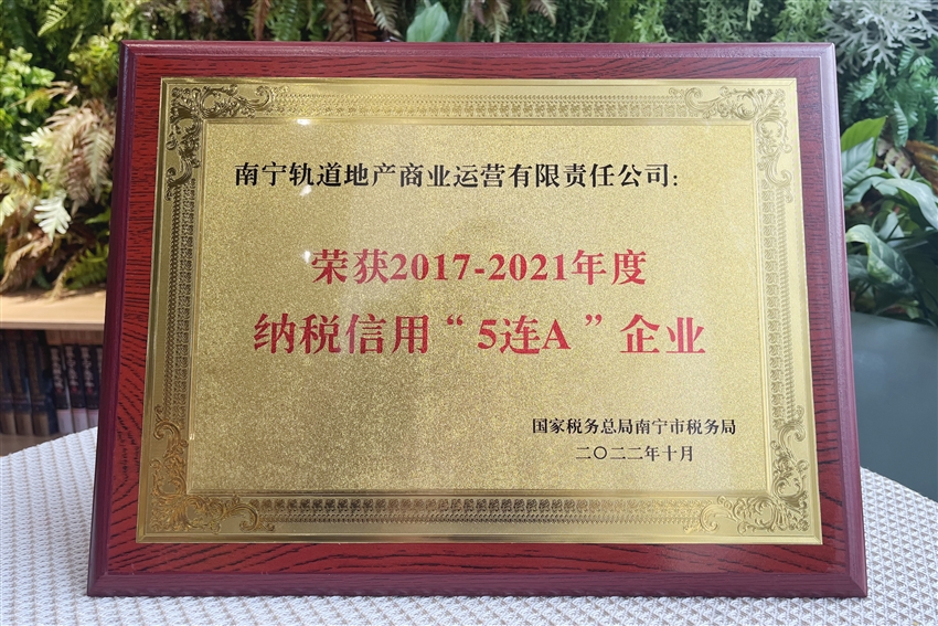近日,軌道地產(chǎn)商業(yè)公司榮獲國家稅務(wù)總局南寧市稅務(wù)局授予的納稅信用“5連A”企業(yè)榮譽(yù)稱號。獲此殊榮,不僅是稅務(wù)機(jī)關(guān)對軌道地產(chǎn)商業(yè)公司稅務(wù)管理工作的充分肯定,更為軌道地產(chǎn)商業(yè)公司走高質(zhì)量發(fā)展之路提供了強(qiáng)有力的支撐。