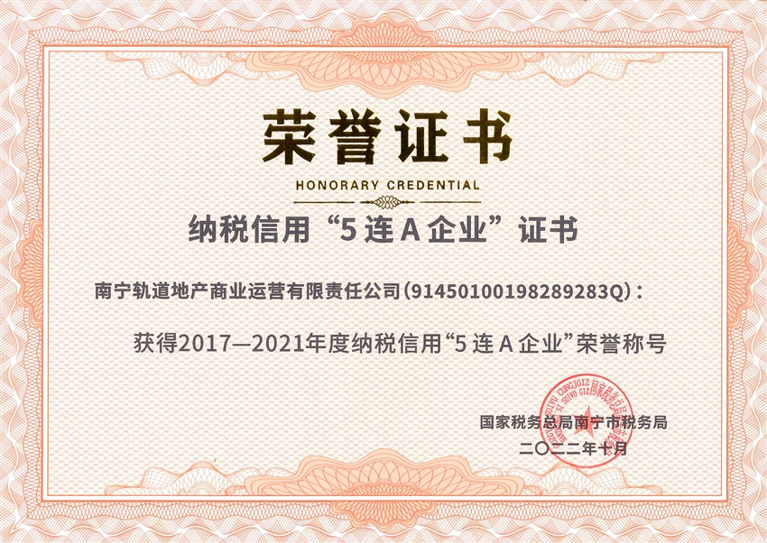 【喜報】誠信納稅 守法經(jīng)營!軌道地產(chǎn)商業(yè)公司榮獲納稅信用“5連A”企業(yè)榮譽(yù)