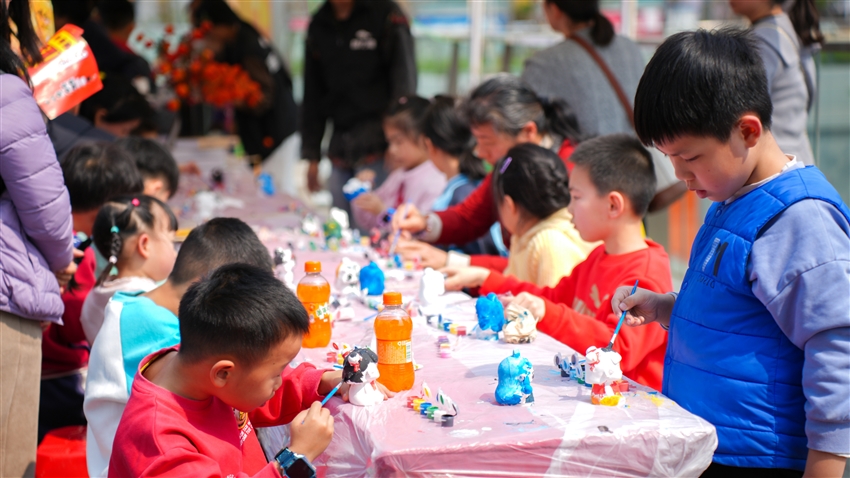 在創(chuàng)意手作區(qū),也吸引了眾多小朋友的目光。在這里大家可以用黏土塑造哪吒,用彩筆描繪敖丙,用糖畫勾勒太乙真人。還可以體驗(yàn)漆扇、香囊等非遺手作。各種創(chuàng)意手作活動(dòng)讓大小朋友們感受到了民俗文化與哪吒元素的奇妙融合,玩得不亦樂乎!
